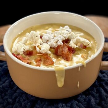 A delicious, CLASSIC WISCONSIN soup recipe! Topped with bacon and POPCORN and served with a side of pretzels – it doesn’t get more Midwest than that!